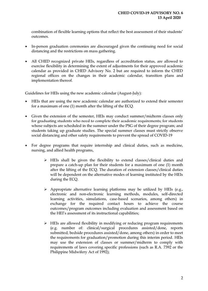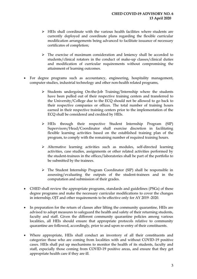 In connection with the Memorandum from the Executive Secretary dated 7 April 2020 which provides for the continuation of the enhanced community quarantine (ECQ) and the stringent social distancing measures (SSDM) to cover the entire Luzon until 30 April 2020, the Commission on Higher Education (CHED) hereby issues this advisory to all HEIs in the country. This advisory should be read in conjunction with the previously issued CHED Advisories on COVID-19 (Nos. 1-5).