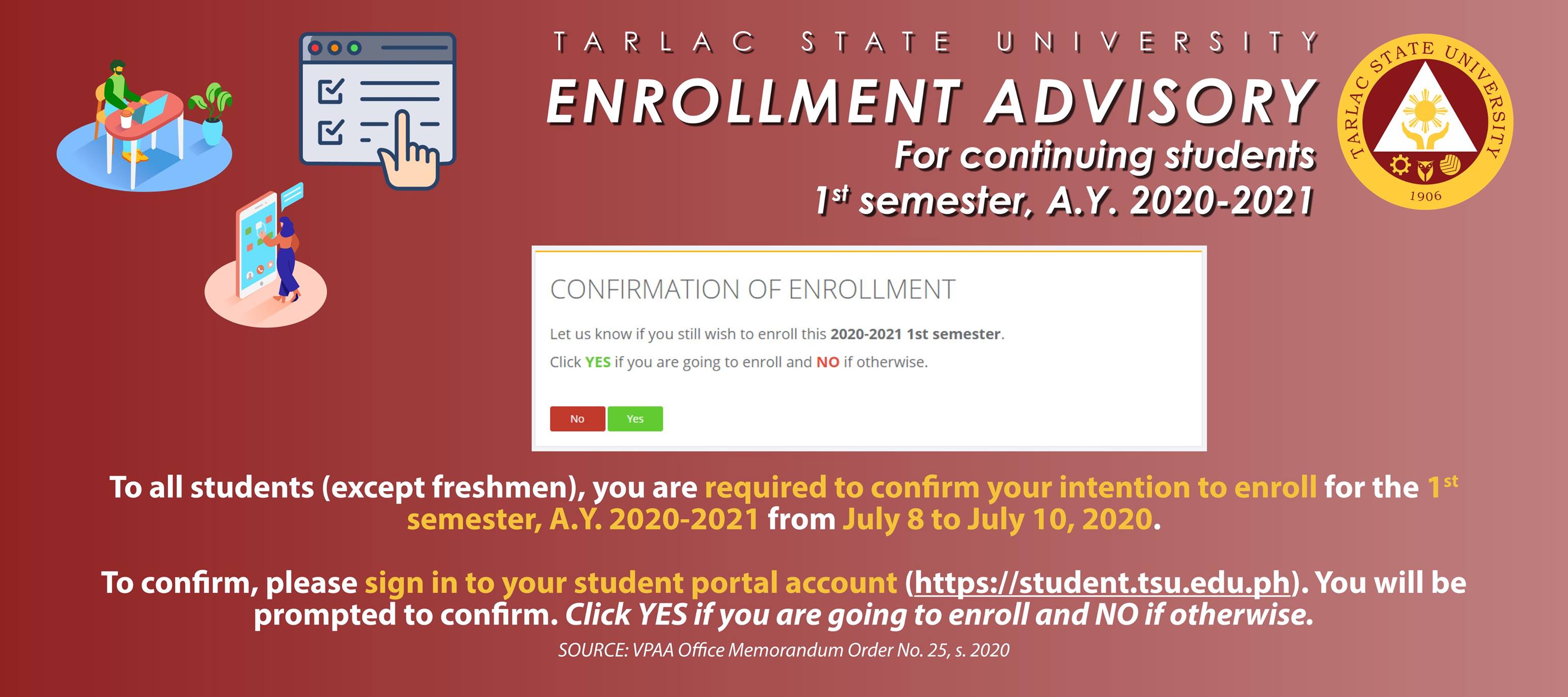 To confirm, please sign in to your student portal account (https://student.tsu.edu.ph). You will be prompted to confirm. Click YES if you are going to enroll and NO if otherwise.