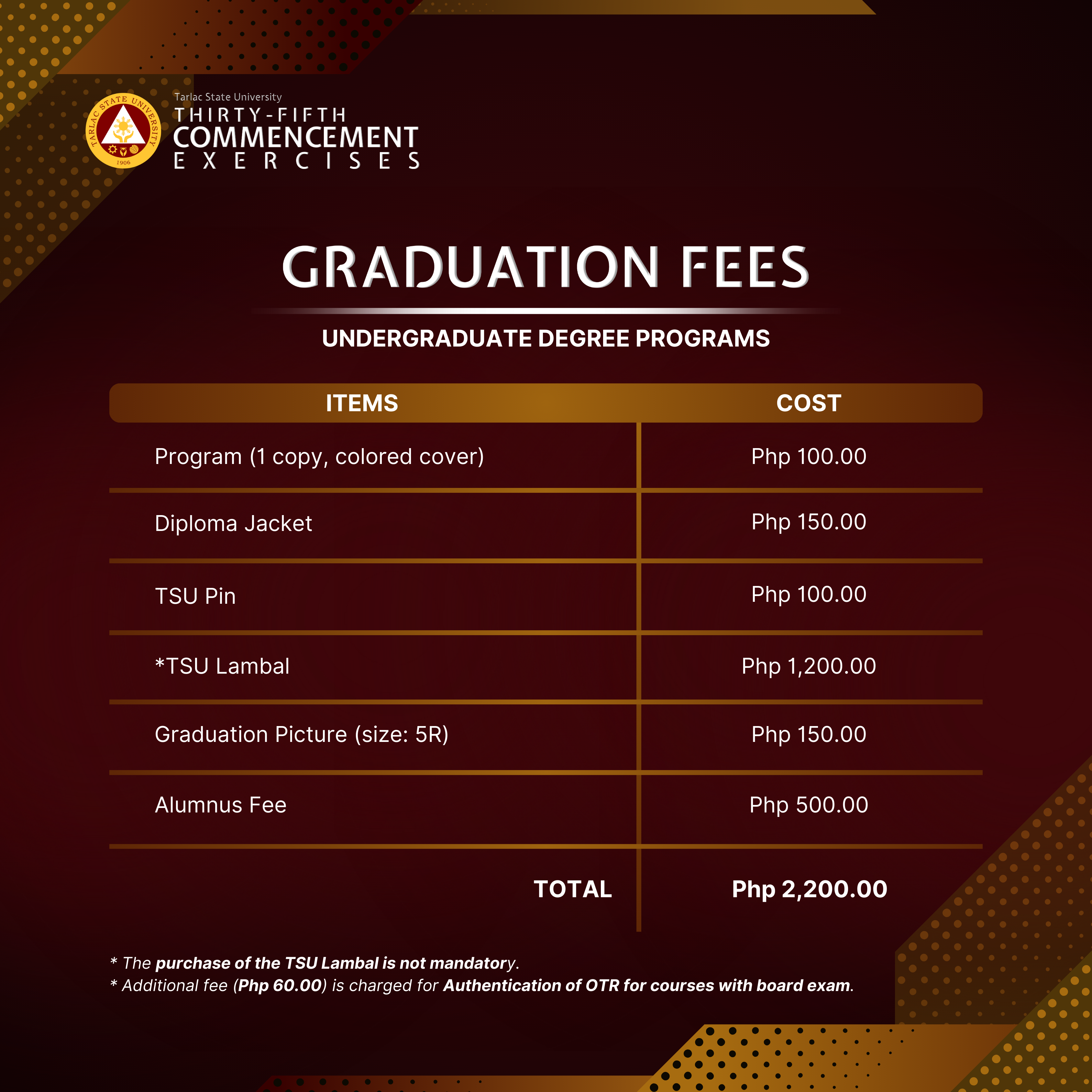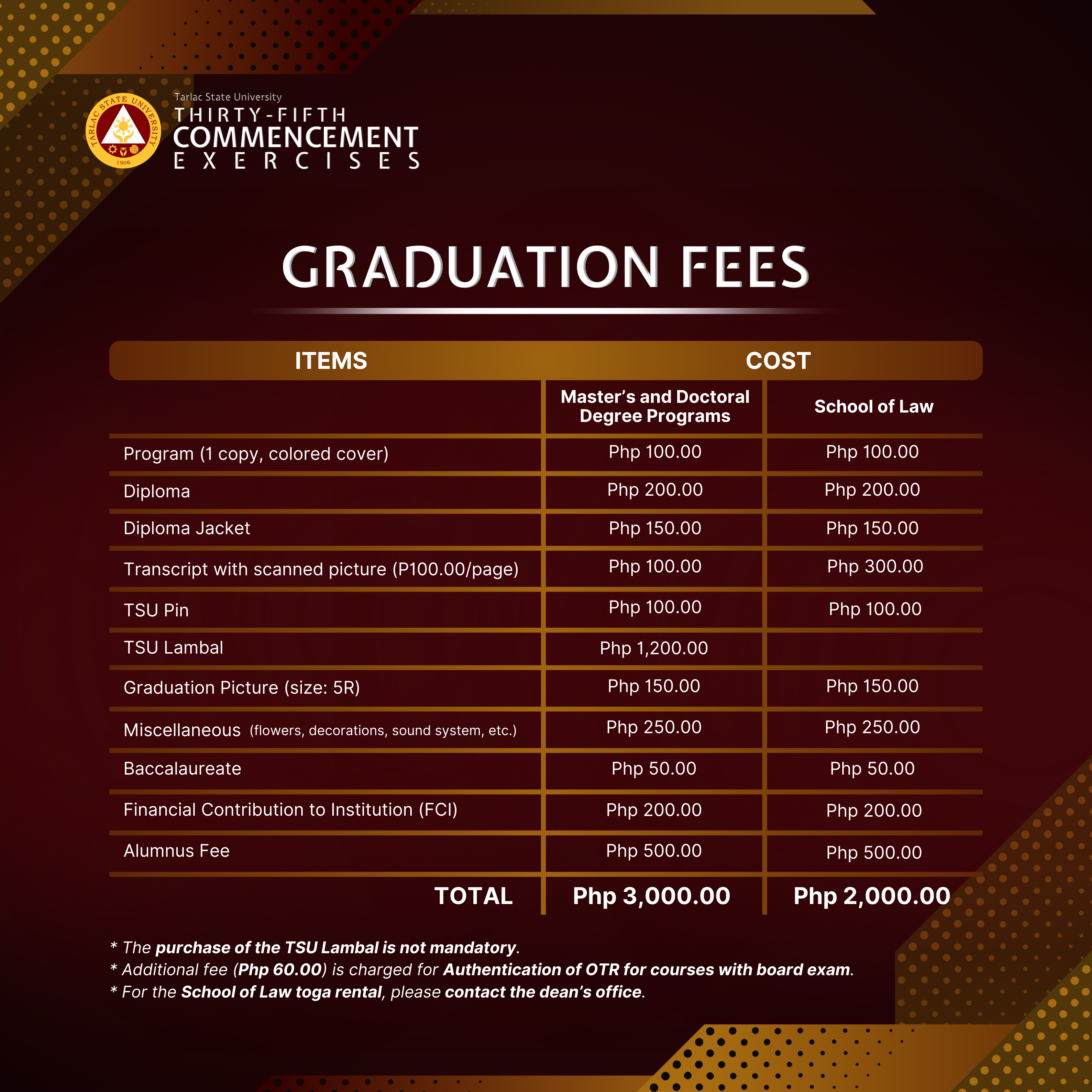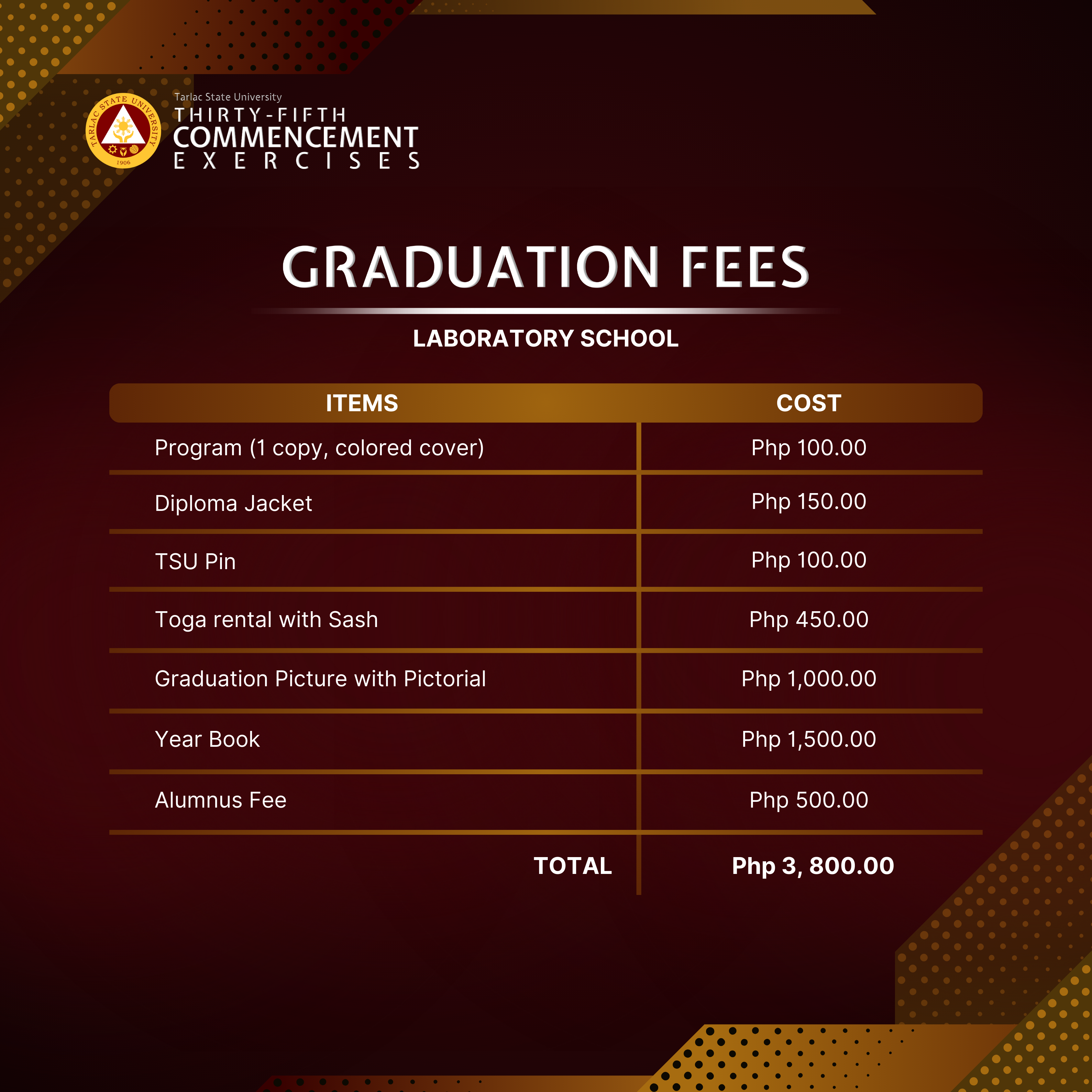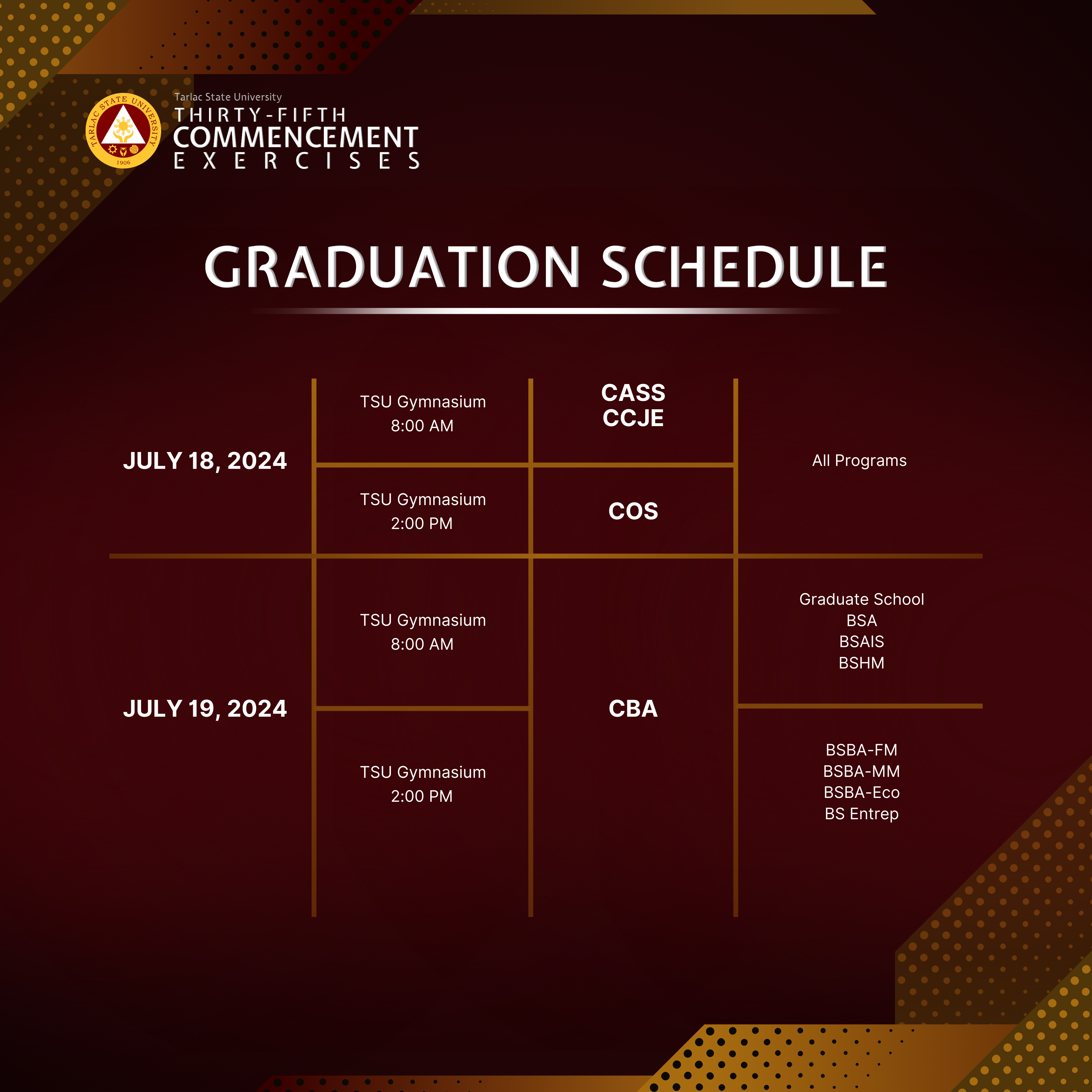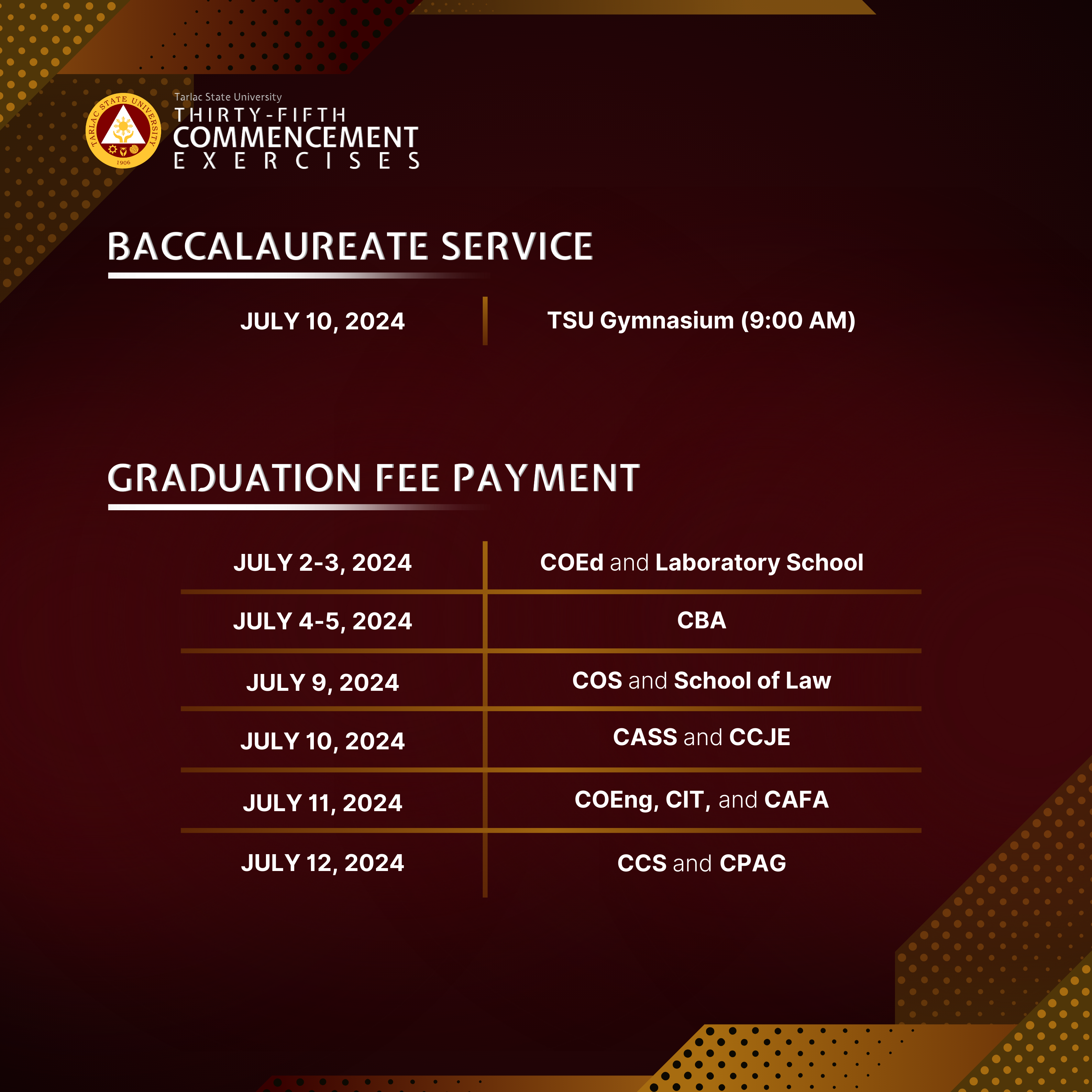 To all candidates for graduation, here are the graduation activities for the 35th Commencement Exercises that will be held this July 2024.