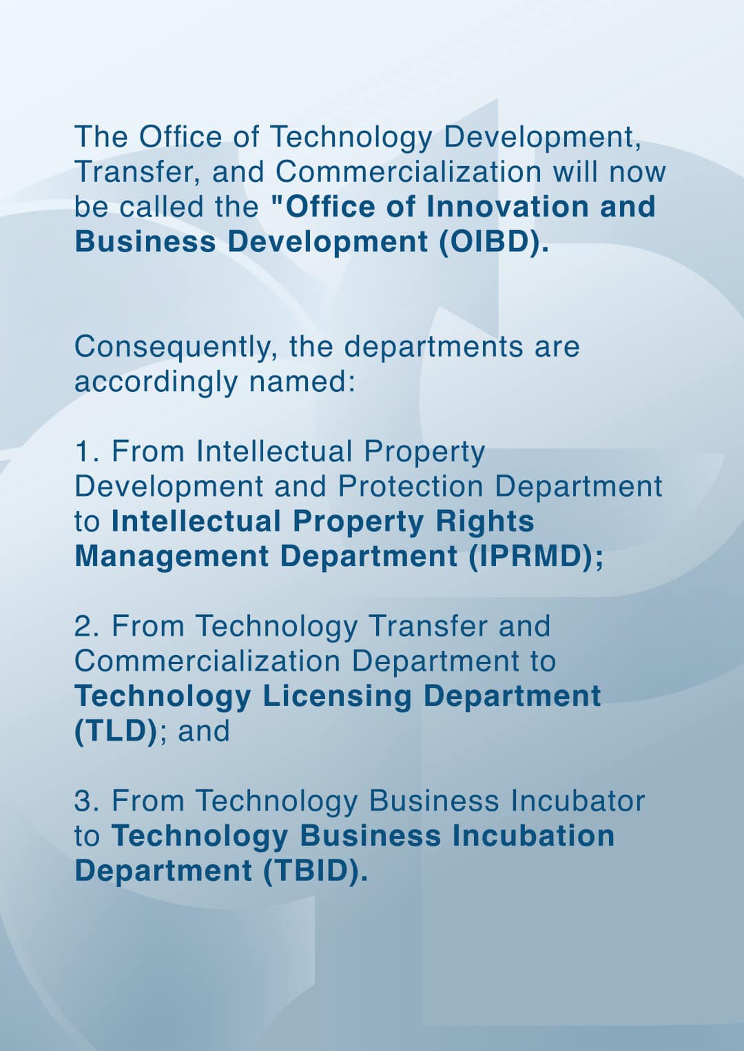 Moreover, the renaming is aligned with the Office of Innovation and Business Development (OIBD), formerly the Office of Technology Development, Transfer, and Commercialization. The OIBD's name change was effective last March 26, 2024, through Resolution No. 26, s. 2024.
