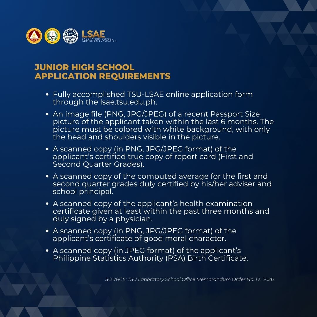 The online application for the Tarlac State University-Laboratory School Admission Evaluation (TSU-LSAE) will be open beginning February 1, 2026 (Sunday) until February 28, 2026 (Saturday).