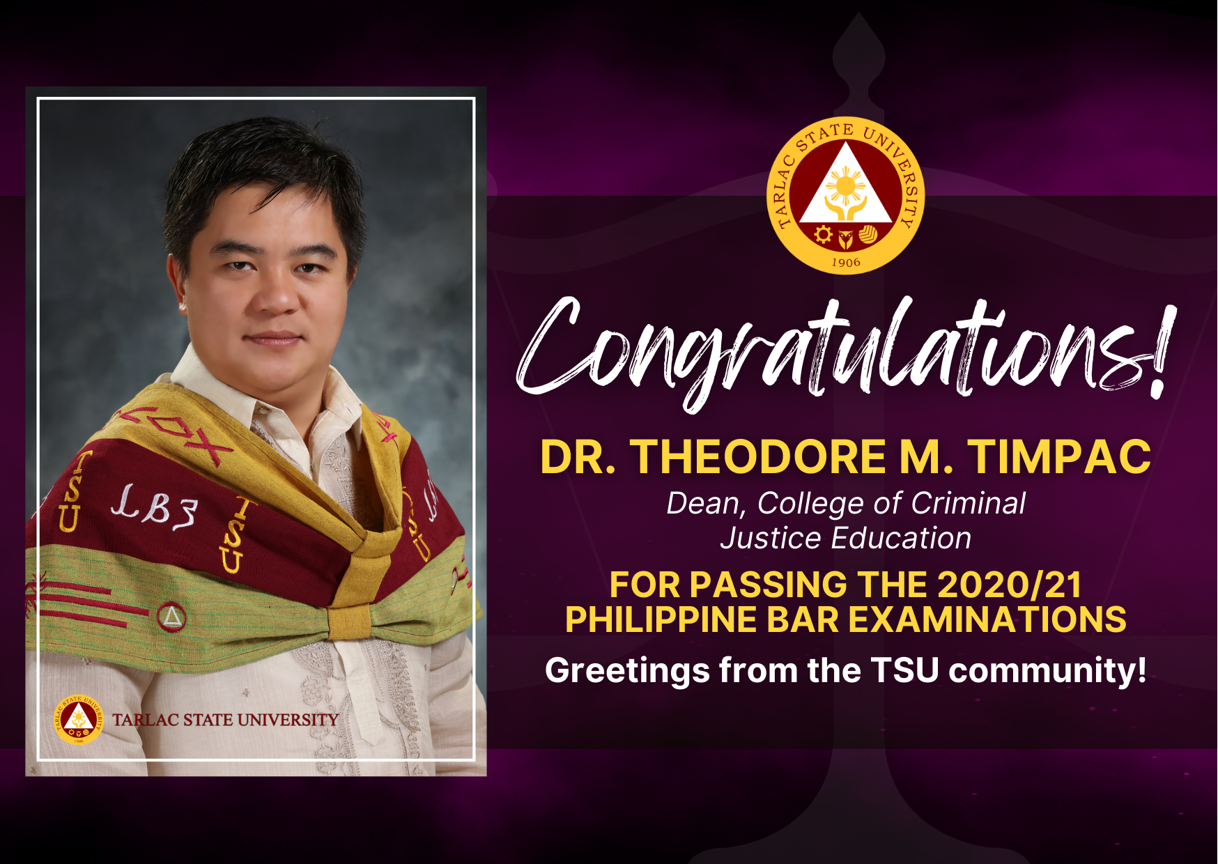 Meanwhile, College of Criminal Justice Education Dean Dr. Theodore M. Timpac also passed the Bar exam.